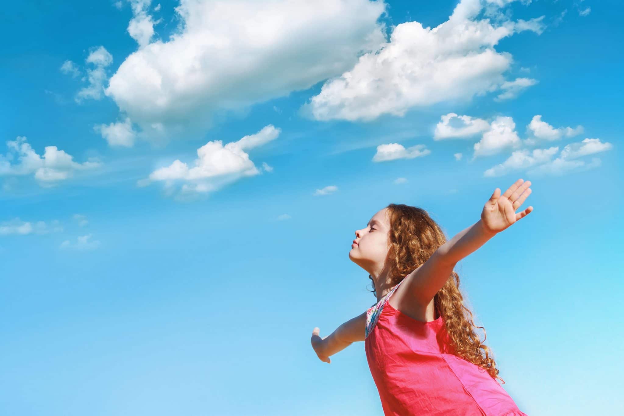 Little girl outstretched arms and closed her eyes enjoying and breath fresh air.